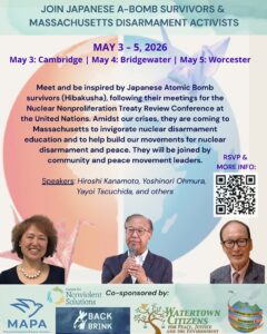 Meet and be inspired by Japanese Atomic Bomb survivors (Hibakusha), following their meetings for the Nuclear Nonproliferation Treaty Review Conference at the United Nations. Amidst our crises, they are coming to Massachusetts to invigorate nuclear disarmament education and to help build our movements for nuclear disarmament and peace. They will be joined by community and peace movement leaders.
