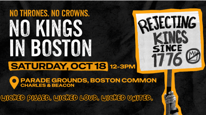 On October 18, Boston will be one of 10 “anchor cities” around the nation to host No Kings II! The more people in Boston from noon to 3 PM, the better! If you’ve got an event near you in the morning, please attend and then go to Boston Common! Hope to see you there! Sign up here.